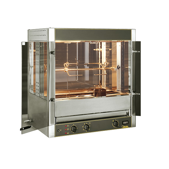 El asador eléctrico RBE 25 de balancines está equipado con resistencias metálicas en la parte inferior y con tubos de cuarzo infrarrojos en la parte superior. Sus 5 balancines pueden recibir del orden de 25 piezas (aves, piernas, caza, asados...). Mantenimiento fácil : balancines, árbol, reflectores, plato con anti-olas, enteramente desmontables.