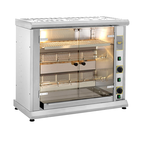 Los asadores con 2 espadas, están disponibles en versión gas y eléctrica, para rostir de 4 a 8 piezas. Están equipadas de una reserva estufa en la parte de arriba para mantener a temperatura las aves.
