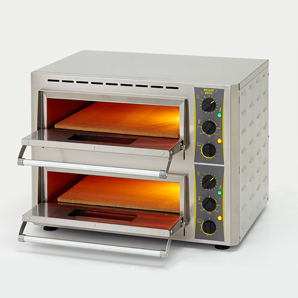 Única en el mundo, esta gama de hornos de pizza con tubos de cuarzo infrarrojos (1050º) y piedra refractaria permite unos resultados de cocción excelentes, para pizzas de Ø 41cm (16’’) o pizzas italianas Trattoria (bandeja de 400 x 600 mm) gracias a una doble regulación de temperatura, por una parte de la suela y por otra parte de los infrarrojos superiores (patentado®):