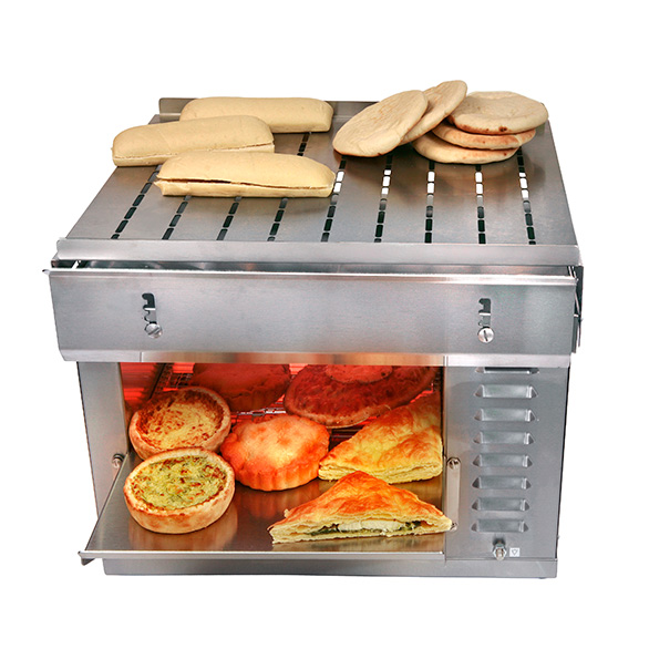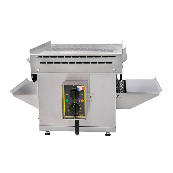 Equipamiento: 8 tubos de cuarzos infrarrojos (1550 W arriba, 1450 W abajo) con parrilla de protección (patentada), techo reposa-snack, selector de calentamiento, variador de velocidad, alfombra del tostador en acero inoxidable, bandejas delantera y trasera de 15cm, pilotos de control, motores ventilados, pies regulables, cepillo de mantenimiento para la alfombra.