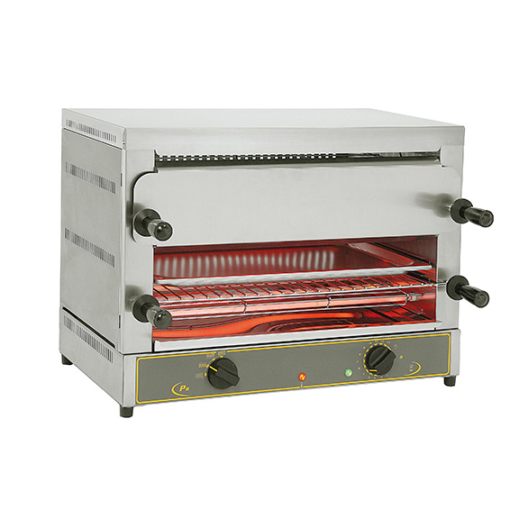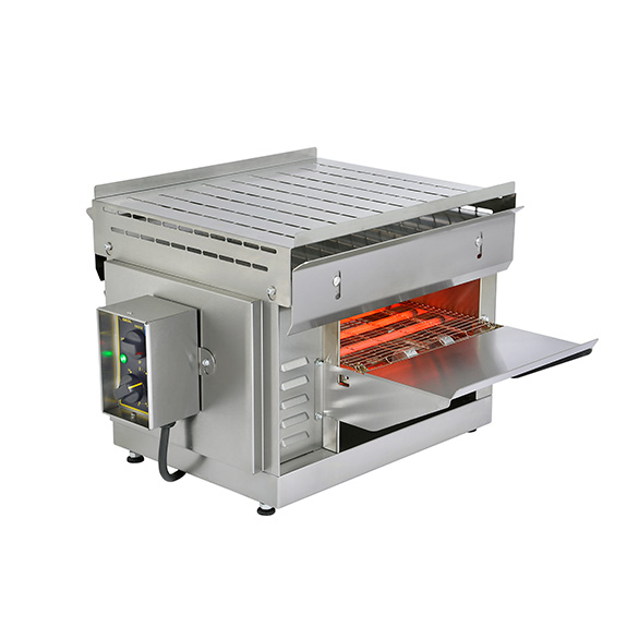 Características: con 8 tubos de cuarzo (1200 W en la parte de arriba, 1450W en la parte de abajo), techo alveolado con rejilla protectora, selector por zonas cuarzo (arriba, abajo, ambas zonas), variador de velocidad, piloto de control y pies regulables. Rejilla de recepción trasera, las placas de carga y de recepción son móviles para su limpieza.
