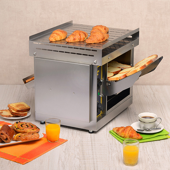 Ideal para buffets de desayuno, esta tostadora de túnel, versátil universal y de gran capacidad permite tostar gofres, bagels, buns y todo tipo de pan con un rendimiento óptimo: de 300 a 540 tostadas / hora según tipo de rebanadas, sin pre-calentamiento.